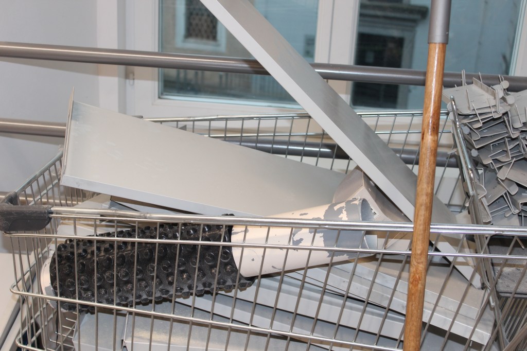 The design of the Laboratory for Biomaterials focuses on the reuse of materials. Iron tables from a ceramics workshop were converted to house sinks salvaged from an abandoned school. Shelves were created from old metal parts, cut and folded without welding to enable modularity. The project combines industrial materials with playful elements such as a colorful chessboard and a pink granite top.