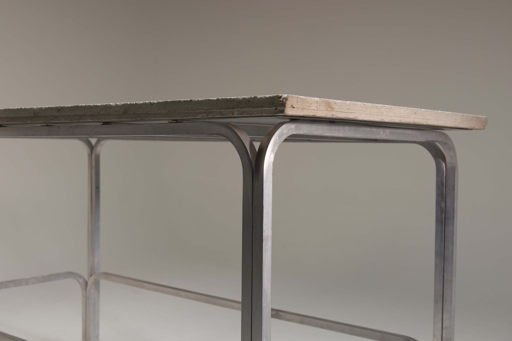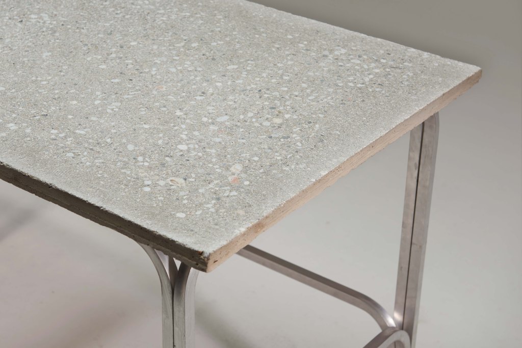 The table is made from cementitious binder, crushed ceramic bricks, sea shells, marble stones, glass and other recycled elements coming from different sites together with aluminum legs. The materials speak for themselves, both in their natural and processed form. The clean lines of the design aim to create a contrast between the elements. The aesthetic evokes the traditionally “Venetian Seminato”, technique developed to reuse stone offcuts. Differently the arches suggest the “Passerelle” (elevated walkways) used to facilitate the pedestrian path of tourists during high water. A provocative result which gathered conflicting events: The industrial landscape of the “Casse di Colmata” (3 artificial islands made of excavated recycled materials) can be found in the stone surfaces frailly suspended on the consequences of their own; These raised routes ensure to keep people at a safe level when tide is expected to reach flood levels.